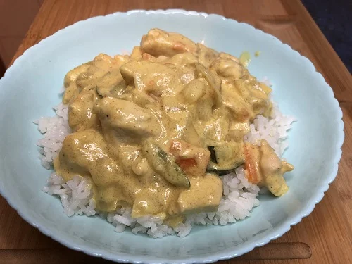 A continuación te voy a enseñar mi receta de pollo al curry con nata, que tu puedes sustituir por leche de coco si lo prefieres. El sabor de esta receta recuerda a una mezcla entre un pollo al curry Hindú como el curry masala y el típico pollo al curry chino. No tiene un sabor muy potente así que si a ti te gusta un curry fuerte solo tendrías que añadirle mas cantidad de especias y listo. Lo mismo si prefieres que la salsa de curry pique, añádele el picante que mas te gusta.